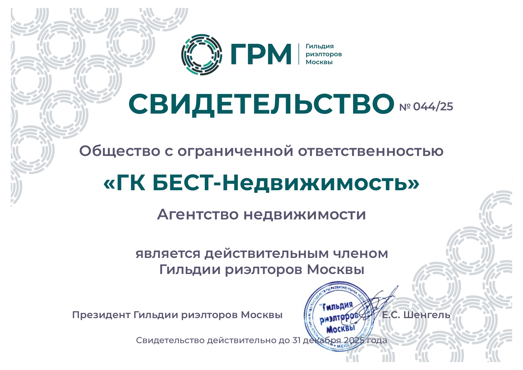 Наше агентство является членом Российской Гильдии Риелторов. По версии международного исследовательского центра MARC, "БЕСТ" входит в пятерку крупнейших риелторских агентств в Москве. Мы опираемся на более чем 25-летний опыт работы и предлагаем клиентам выгодные условия сотрудничества:
