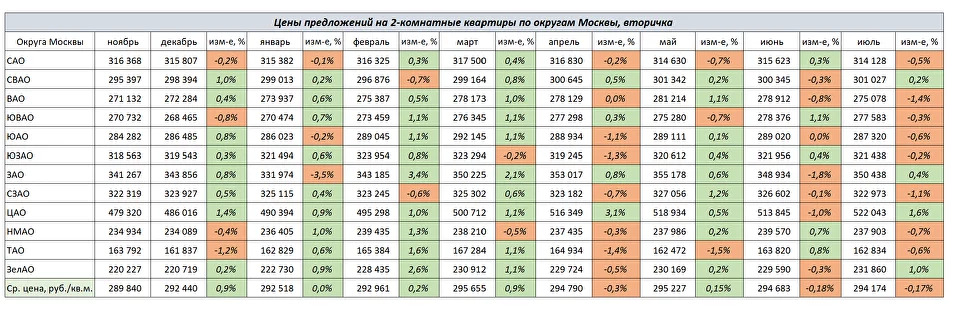 В июле изменение цен в сегменте 1-комнатных квартир было разнонаправленным. Лидером роста стал ЗелАО, +1,7%. Снизились цены более всего в ЮАО (-1,2%).
