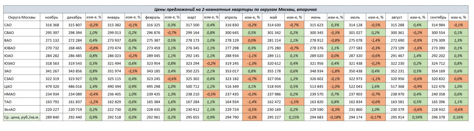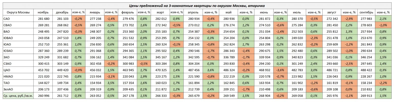 В сегменте 1-комнатных квартир в сентябре лидером роста стал ЦАО, +1,0%. Снизились цены более всего в ЮАО -1,4%.