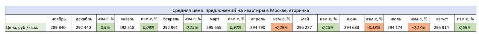 Средняя цена предложения 1 кв. м. московской недвижимости на вторичном рынке на 31 августа 2024 года составила 295 914 рублей (+0,59%). Лидером роста стал ВАО +1,3%, снизились цены в ЗелАо -0,6%.